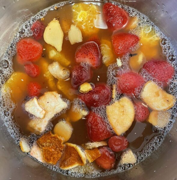 Test av nytt glöggrecept som jag serverade på Honungsbodens öppna hus den 8 december! Äppelmust från egna äpplen som bas, skalade och skivade apelsiner, honung till angenäm styrka och smak, hel kanelstång, hela nejlikor, färsk ingefära, torkad pomerans och även en färsk pomerans (egenhändigt plockad i Salobrena på spanska solkusten). Sist men inte minst frysta jordgubbar!