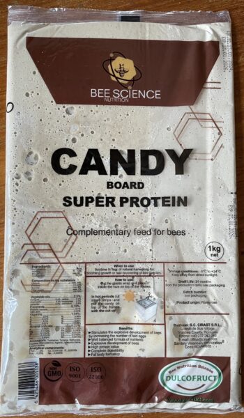 Nu ska jag erbjuda dem Candy board super protein från Dulcofruct som inneåller fruktos 37%, glukos 35%, andra sockerarter 8%, vatten 20%. Dessutom innehåller foderdegen 10 olika aminosyror och många olika vitaminer, mineraler, vegetabiliska oljor.